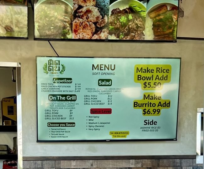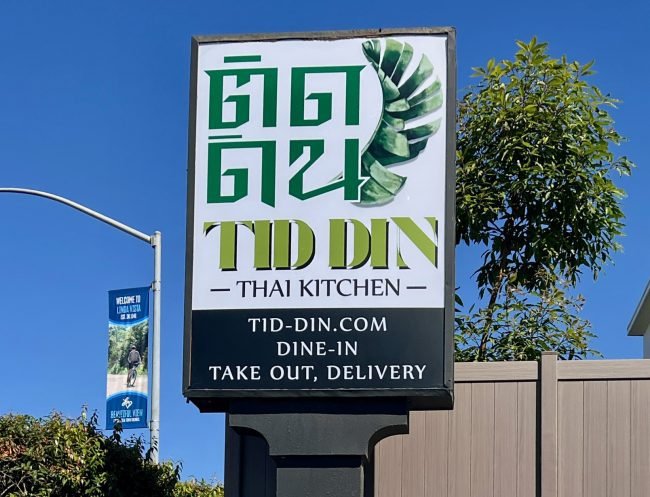 A few months past, I was driving down Linda Vista Road and noticed that Taco Bomb had closed and was being replaced by a Thai Restaurant named Tid Din. While doing a search, I found the place’s website here it stated: