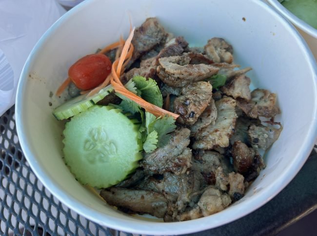 Make it a burrito? Edamame? No larb, no sticky rice…. This looked like a pseudo food court, fast foodish menu. With four different mains. Still, it said “On the grill” which had things like a good Mu Ping on my mind. It seemed weird that a “rice bowl” was an additional $5.50, but a side of Jasmine Rice was $3. I decided on two proteins; the grilled pork ($9) and grilled sliced beef ($12), with a side of Jasmine Rice ($3), medium spicy; with Tamarind and Thai Chili Fish Sauce.