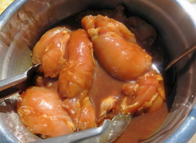 First off; the basic recipe is for about a pound-and-a-half of boneless/skinless chicken thighs. Second, I tenderize each piece of chicken with a mallet. Third, I portion out and divide the sauce…for marinating, basting, and on the side….cause people like to use it for all kines of stuffs.