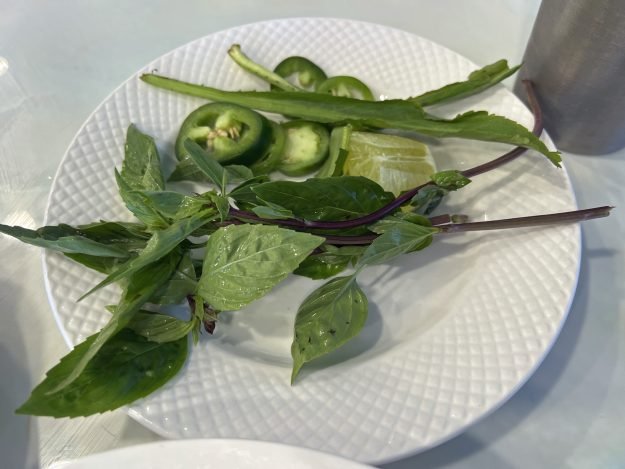 A glass of cold tea was dropped off…along with a plate of garnishes. Looks at all that Ngo Gai! Something that’s a rarity these days.
