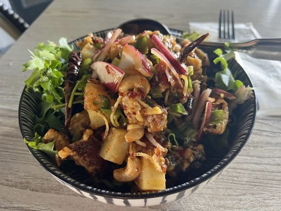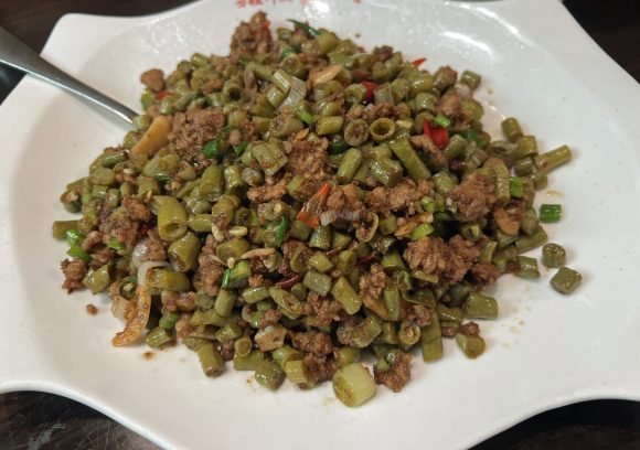 I didn’t know how I’d take to having pineapple in this; but it went fairly well with the dish, adding tart-acidic-sweetness. I liked the crunchy chunks of battered duck, good flavor and texture. While this was indeed more spicy that what I’d had on my previous visit, it was still lacking in bright-pungent-savory tones as a whole.