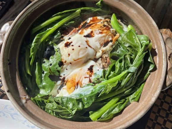 Along with the usual; lup cheong and stuff, we’ve been using left over roast duck from our visits to Eastern Dynasty, Hong Kong Kitchen, and other places, along with more importantly the duck drippings. Duck fat is used to coat the nabe to help build a nice crust. And a 3:1 soy sauce to dark soy sauce mixture to help flavor.