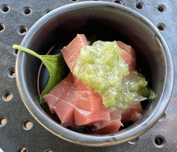 If you understand that it’s leaner chutoro, you’ll do fine. The wasabi “mix”; I’m certain it’s not straight up wasabi does the sinus clearing work…….for some reason, I really enjoyed the brightness the shiso brought to the dish on this day.