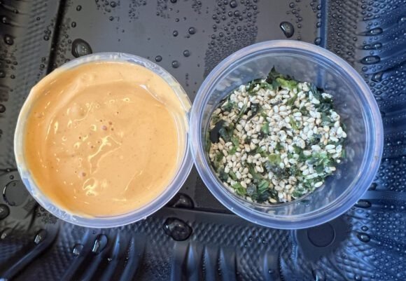 Eventually, the buzzer went off and I picked up my hefty feeling package and headed home. Once home I unpacked. Knowing that I’d be doing takeout, I made sure to get the Sriracha Mayo for karaage on the side.