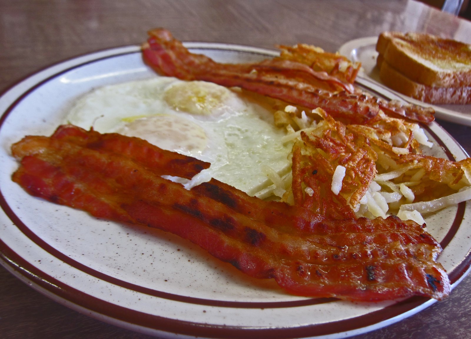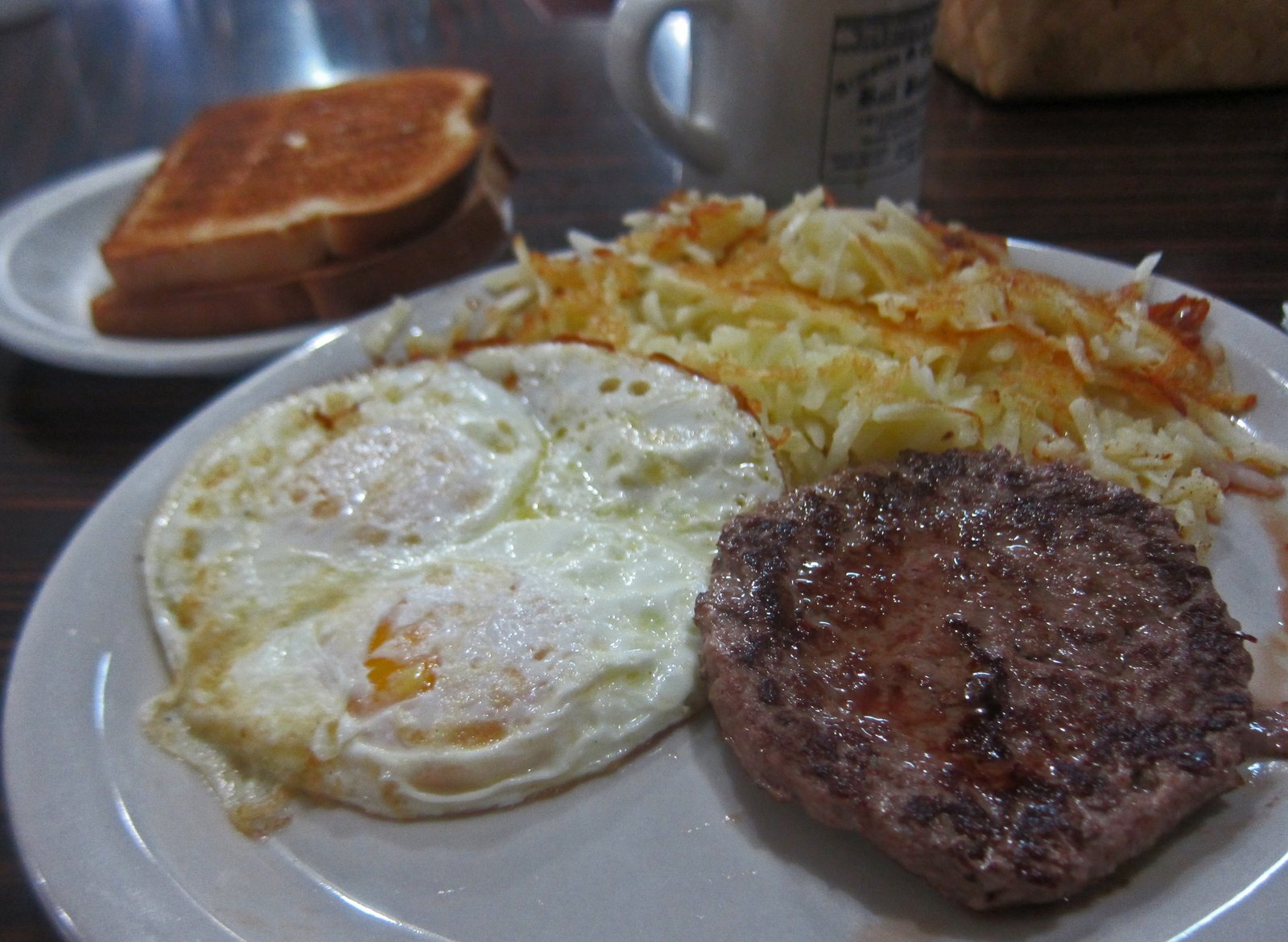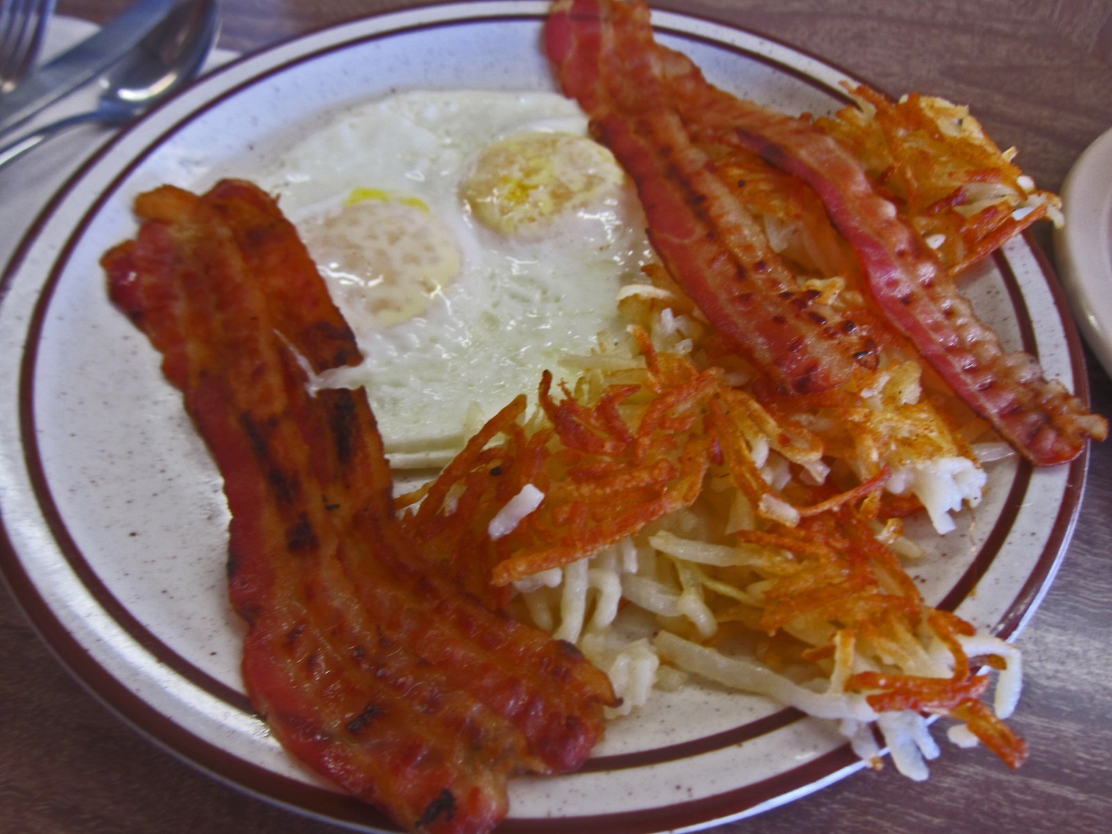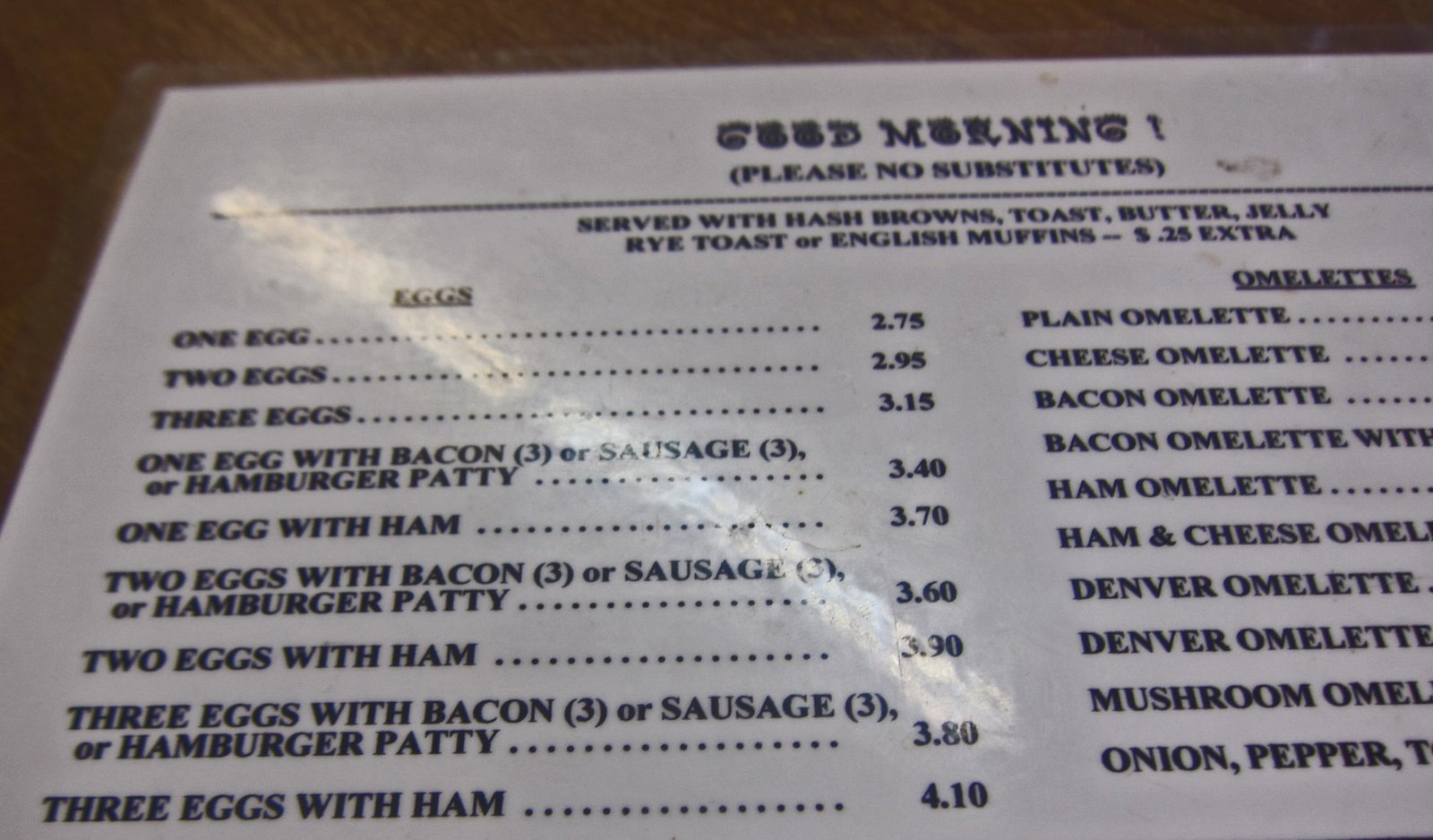 On this day, I had two eggs over easy, bacon, hash browns, white toast…….$3.60….yes three dollars and sixty cents.