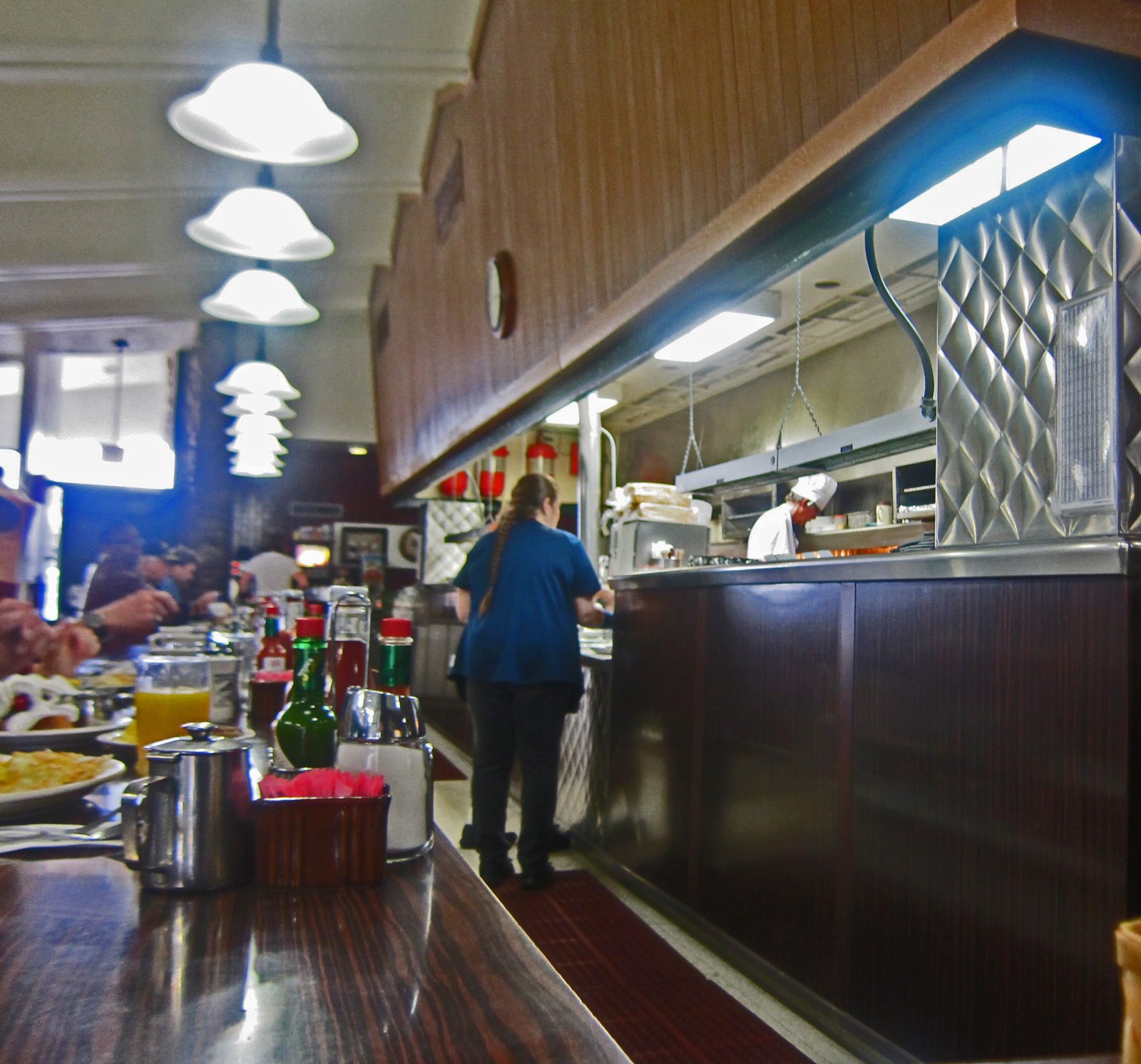 Arriving in the parking lot, it looked like business as usual at Perry's. There was a line out the door waiting for a table. This being a solo breakfast, I easily snagged a seat at the counter….. Which is a pretty nice place to sit as you get to watch the Servers do their thing. You can count the plates the balance on one arm as they make their way to tables…on this day, the winner, a tall blond who looked like she was all business actually took nine plates out in one trip!