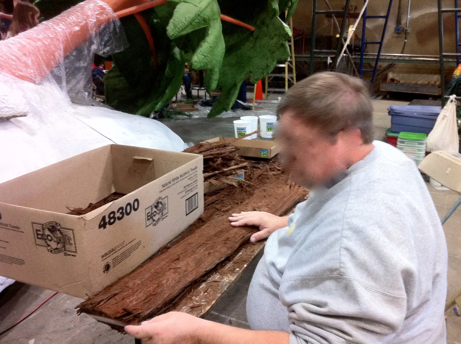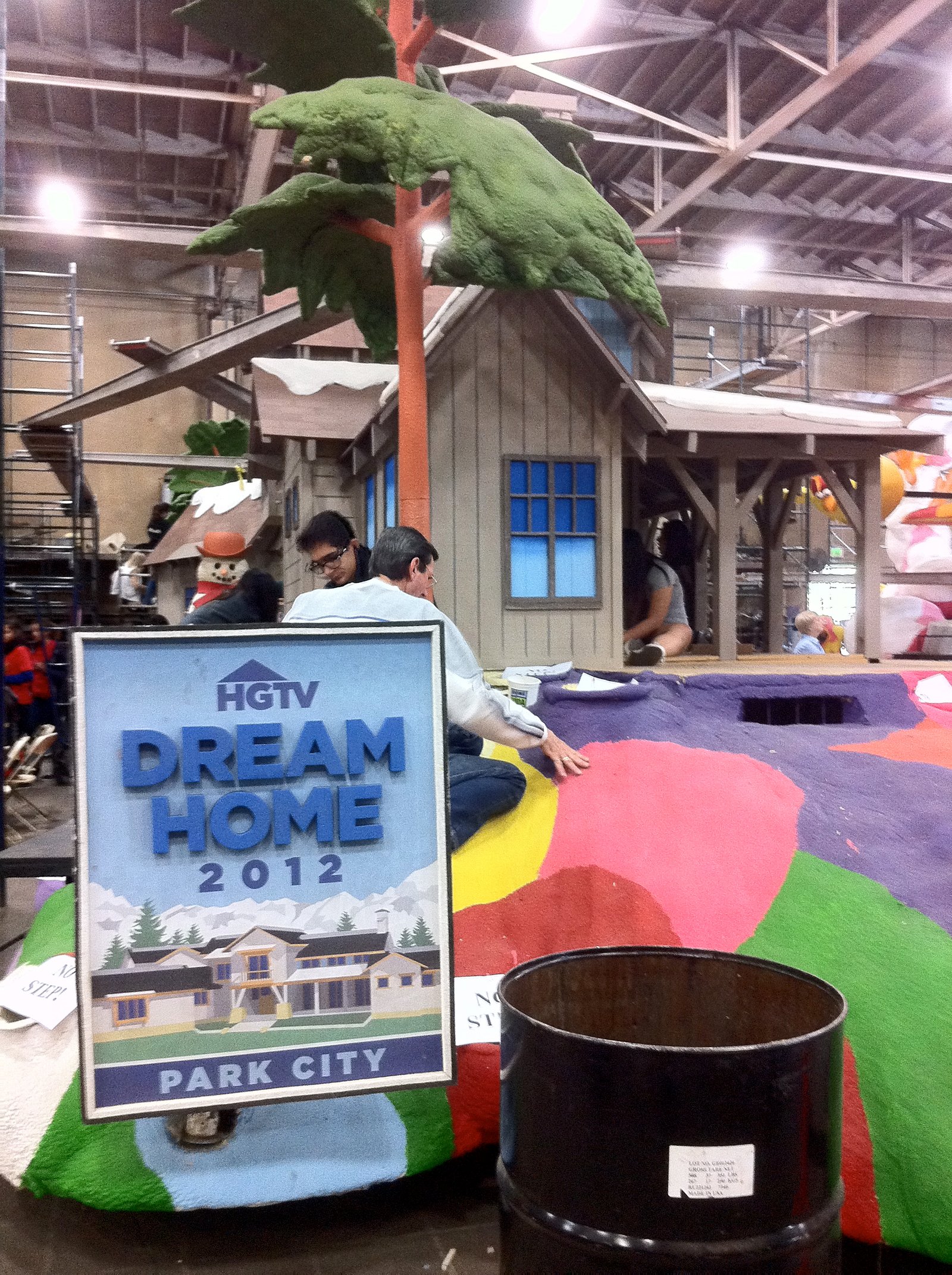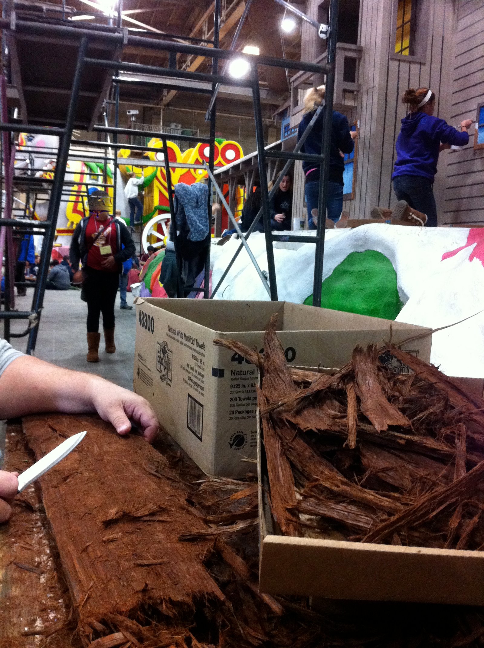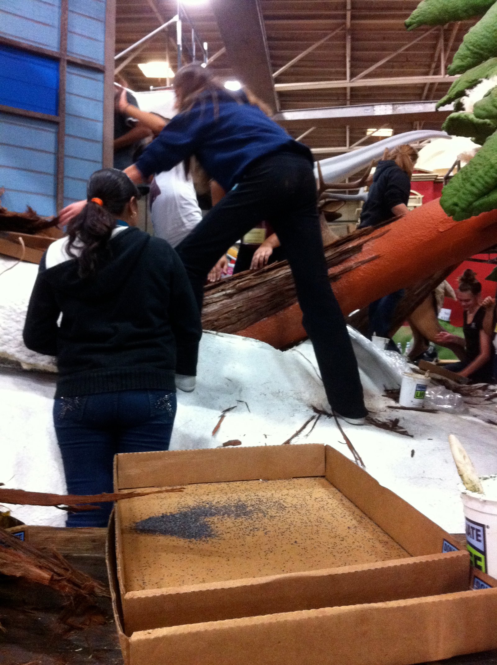 which they shredded down into manageable thin pieces to be glued onto the HGTV float. They filled at least five of the large boxes and too many to count of the smaller one for volunteers to use to cover the trunks and branches on all the pine trees on this float, which has a replica of the HGTV Dream Home that somebody will win next year. In the background of the above photo, the young ladies are gluing bulghur wheat or some grain material onto the window frames. The spaces between the wood planks of the exterior have been filled with glued on poppy seeds.