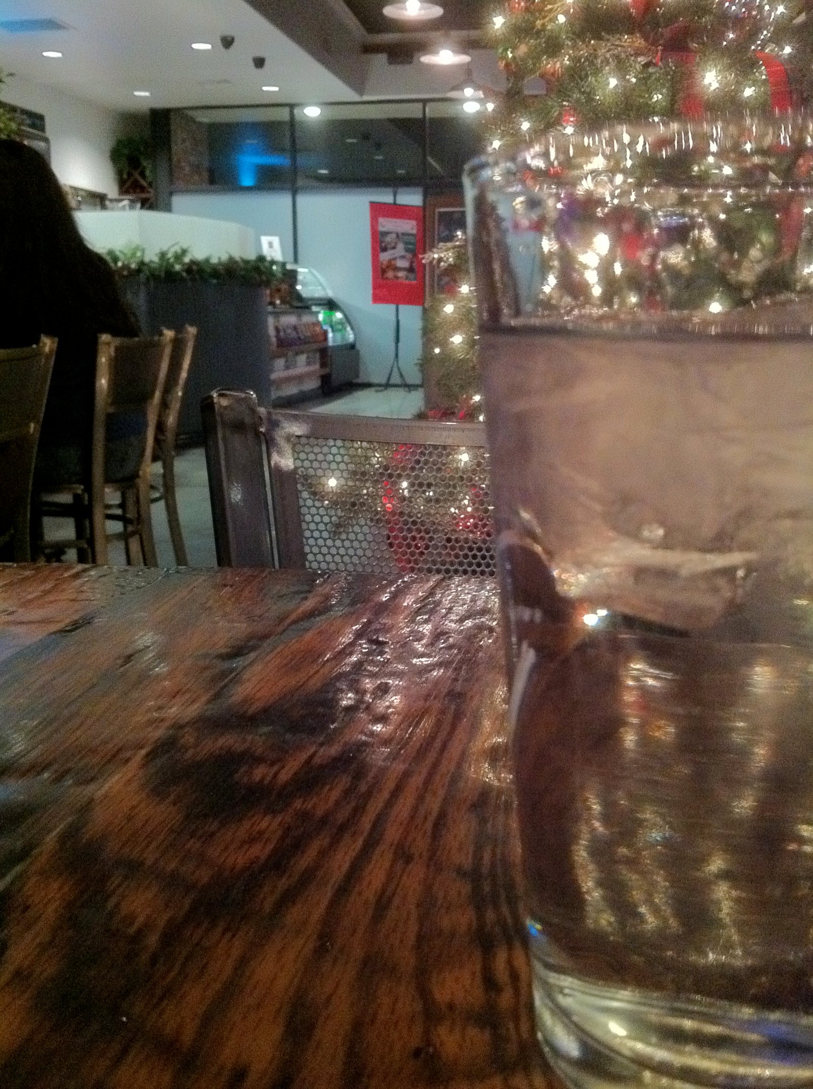We found a seat on the other side of the Christmas tree and admired the beautiful, solid wood table. We noticed the menu noted the food was made with local ingredients, no preservatives, organic fresh baked goods and also microbrews and Napa wines were offered.