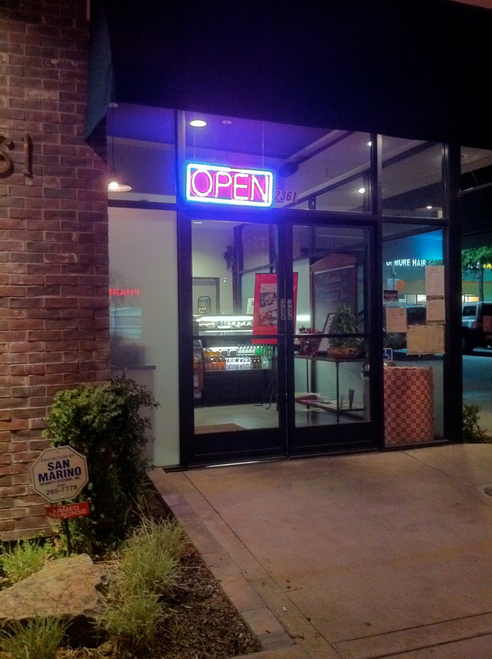 We were stopped at the signal light on Colorado at Sierra Madre and the side of this building on the Northeast corner had a sign about 'proudly serving Peets coffee'. We figured it was a Breakfast-Lunch-Dinner place and pulled into the parking lot.