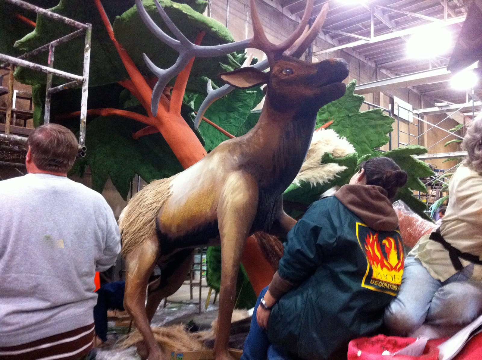 You'll see this elk on the HGTV float, because he is on the 'camera side' of the float. Right now he is only partially covered in dry material. The undersides of the pine trees are covered in glued on dried parsley.