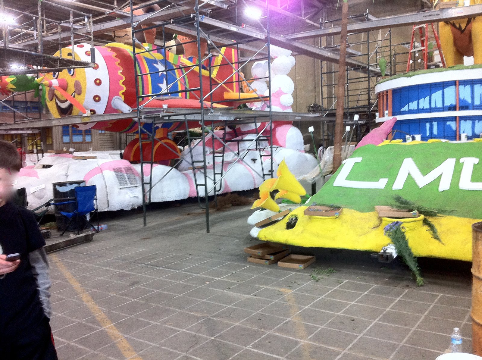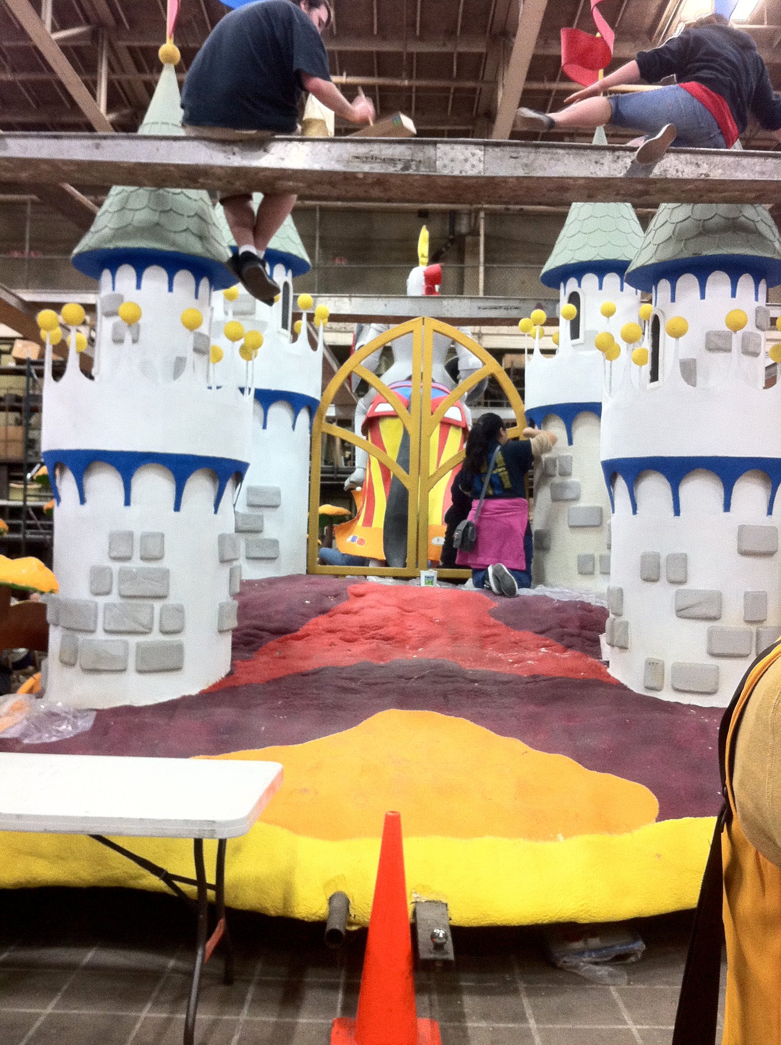 We were at the Rose Palace, 30 minutes before our volunteer time was to start with our group, the Petal Pushers, which coordinates over 5,000 volunteers each year. There were many groups meeting this day to help decorate floats which were designed in February, when the theme of this 2012 Rose Parade was chosen- "Just Imagine". It was 42º outside and chillier inside. We were told to wear warm clothing that we were not afraid to get dirty. I wore three tshirts and an XL sweatshirt. As did most everyone else. This was a "Dry Decorating Day"- the fresh flowers won't go on the floats until 3 days before the parade on January 2, 2012. In other Rose Parade float posts, I've shown you how every visible part of the floats must be covered in living or previously alive materials. These dry decorating days are just as, if not more, important for the complete float to be built.