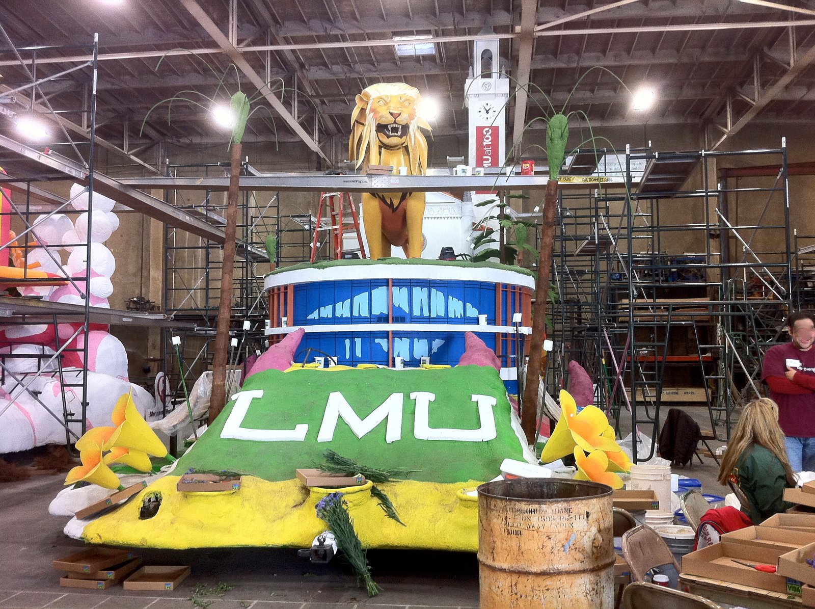 The 100th Anniversary of Loyola Marymount University will be celebrated with this tall(see the steeple in the back ?) float which is using the more blue-colored flower petals of the Statice flowers. It will have real palm leaves attached to the wires on those palm trees.