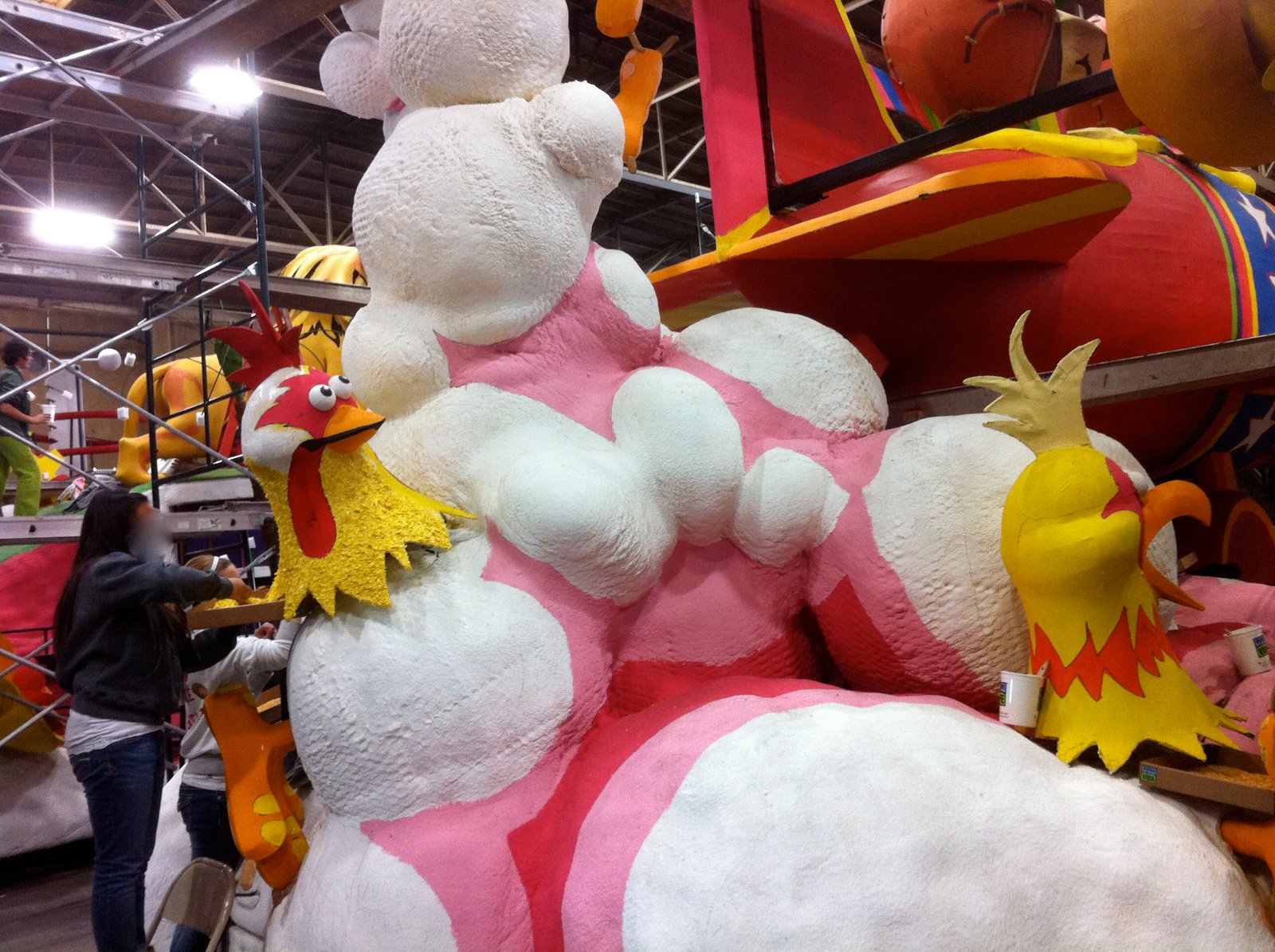 The back of the Shriners Hospital float looks like it has chickens exploding in the exhaust