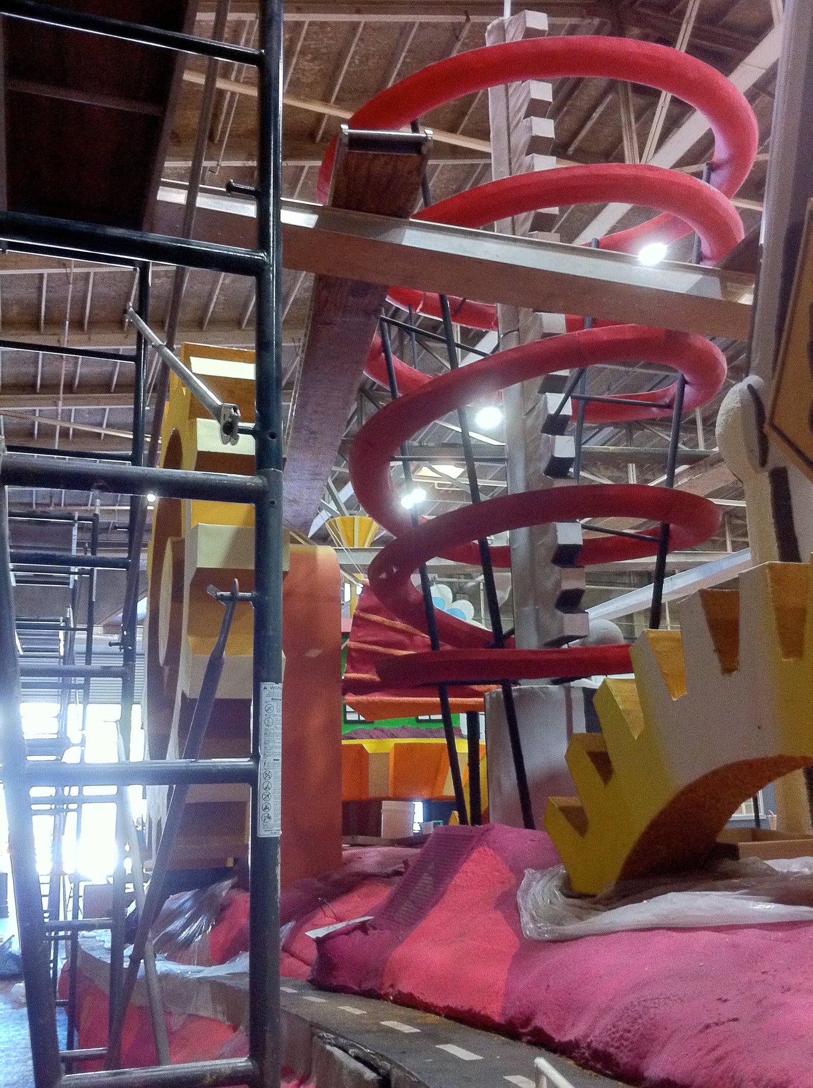 You can see some of the glued on bark at the base of this pine tree. The tree is lying in the position it will collapse to during the parade- when the float passes under street and signal lights.