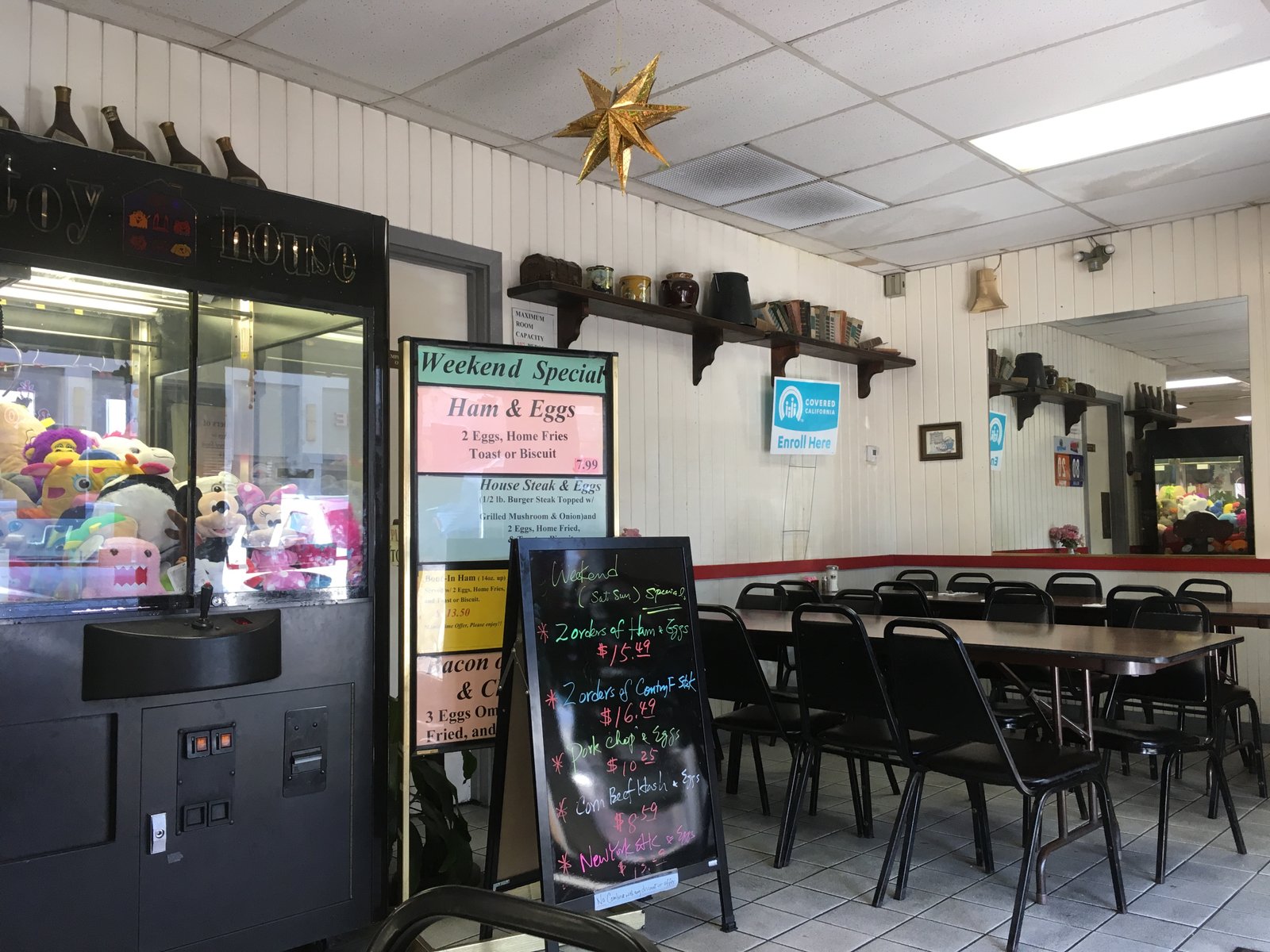 Even at this rather early hour for dinner, the place was humming. Though we had no wait, almost all the tables were taken. We were seated in the covered back area……topped by a bright red-orange tarp, it made all my photos come out rather reddish. So my apologies.