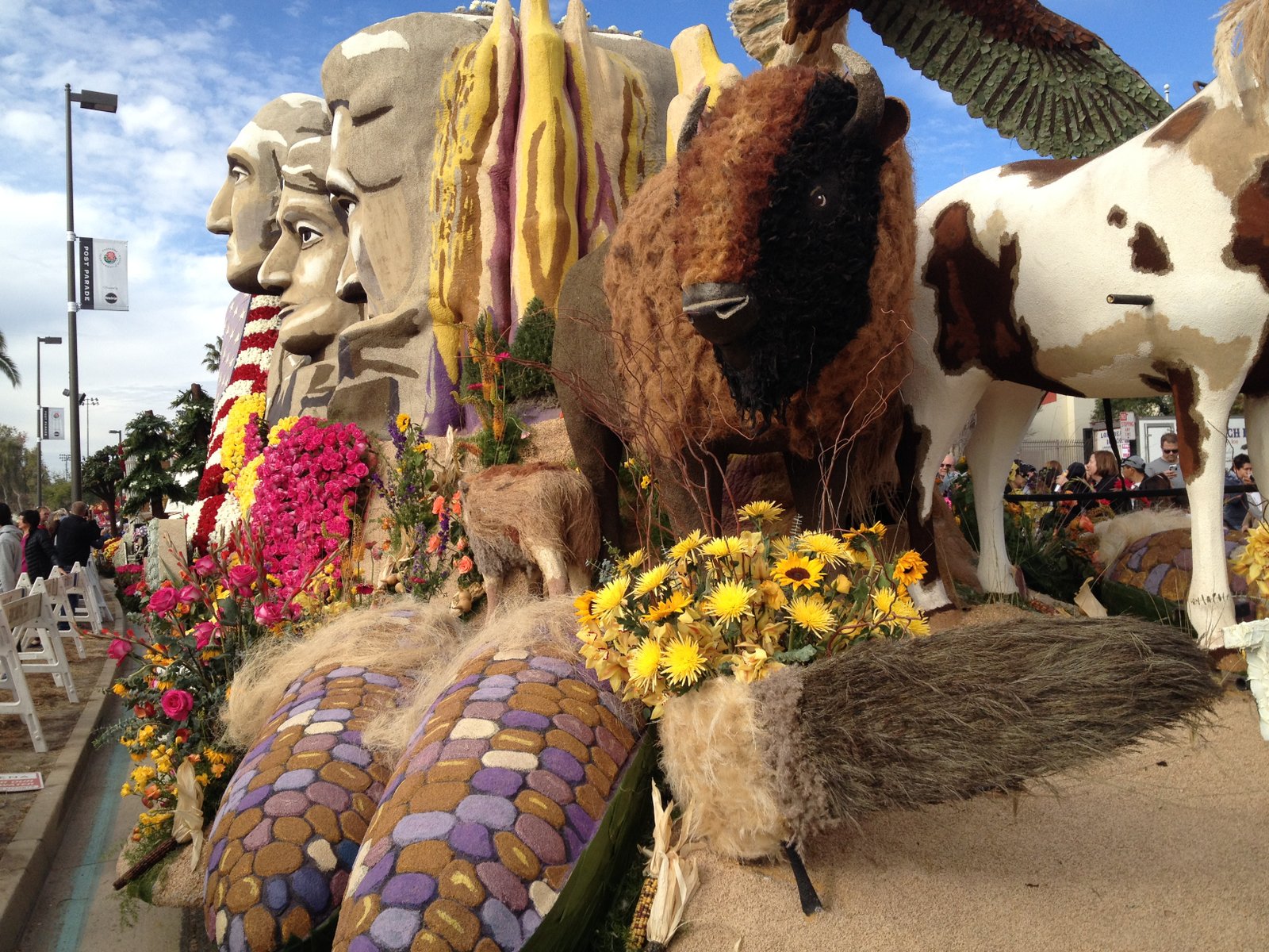 The South Dakota Department of Tourism sponsored this float, "The Great Faces and Great Places of South Dakota", which was overwhelming in detail. Notice the multiple colors/materials used to depict the carved rock and shading of Mount Rushmore. This was my favorite.