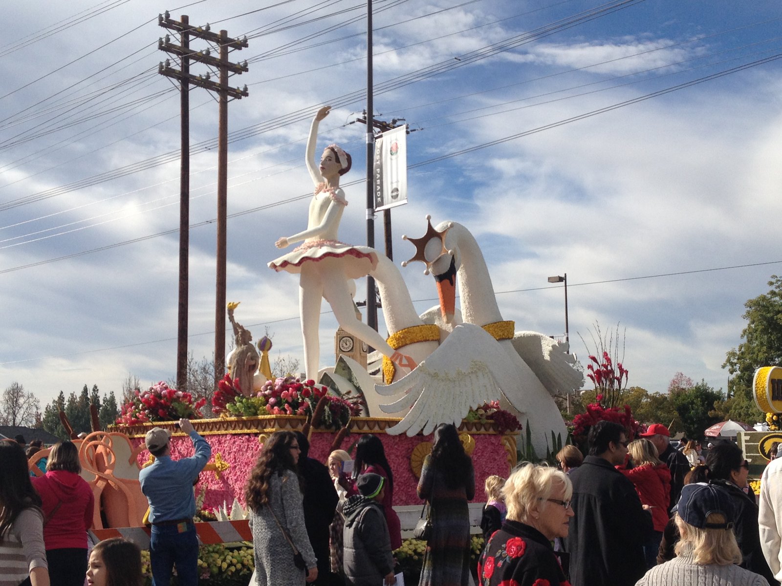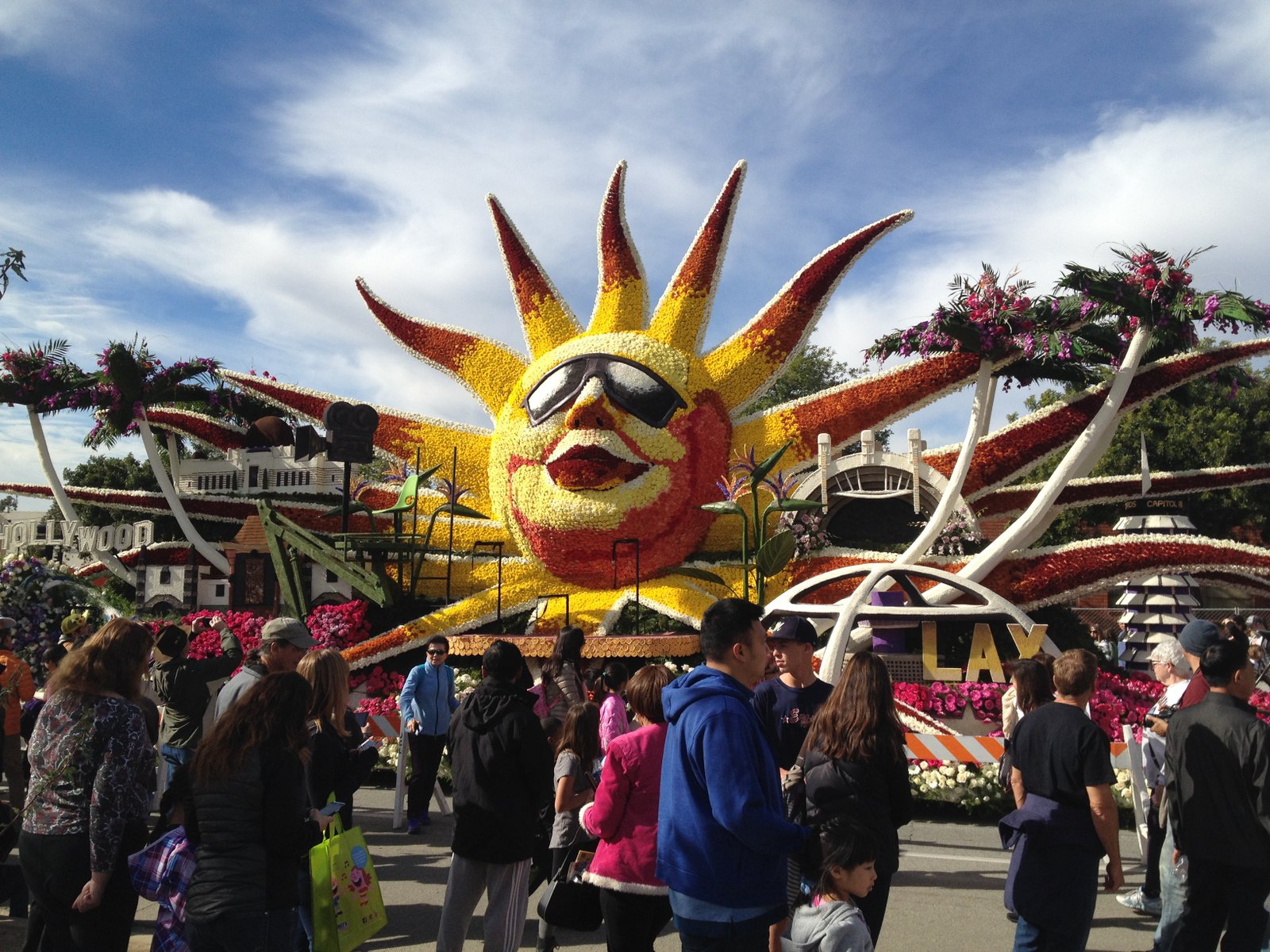 People were posing along the side of the surreally large "Every Second is an Adventure"float sponsored by the Los Angeles Lakers.