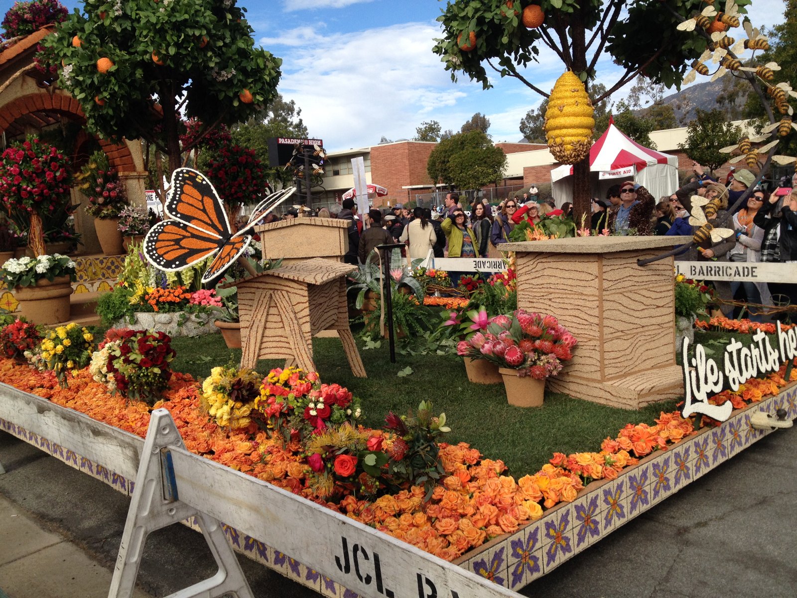 The 'bees' stuck on the beehive on the Miracle-Gro "Life Starts Here" float are really peanuts!