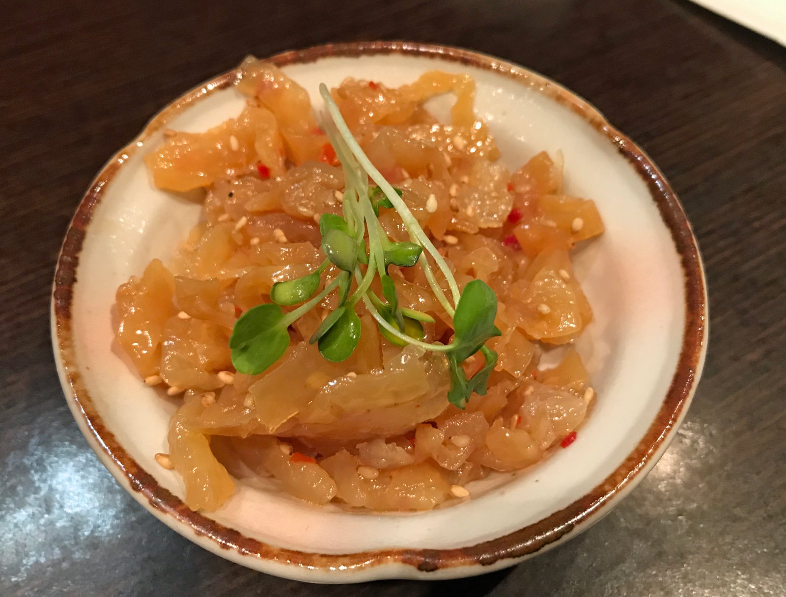 This was wonderfully beefy and savory; with just the right amount of savory (read – miso/soy sauce), tanginess (tomato), sweetness (probably mirin/sake)….we were begging for rice! The tendon and tripe were so tender; the tongue had a wonderful beefiness……that dried pesto toast was a travesty to a dish that truly deserved rice! This was wonderful; the flavors taking me back to Nagoya for some reason.