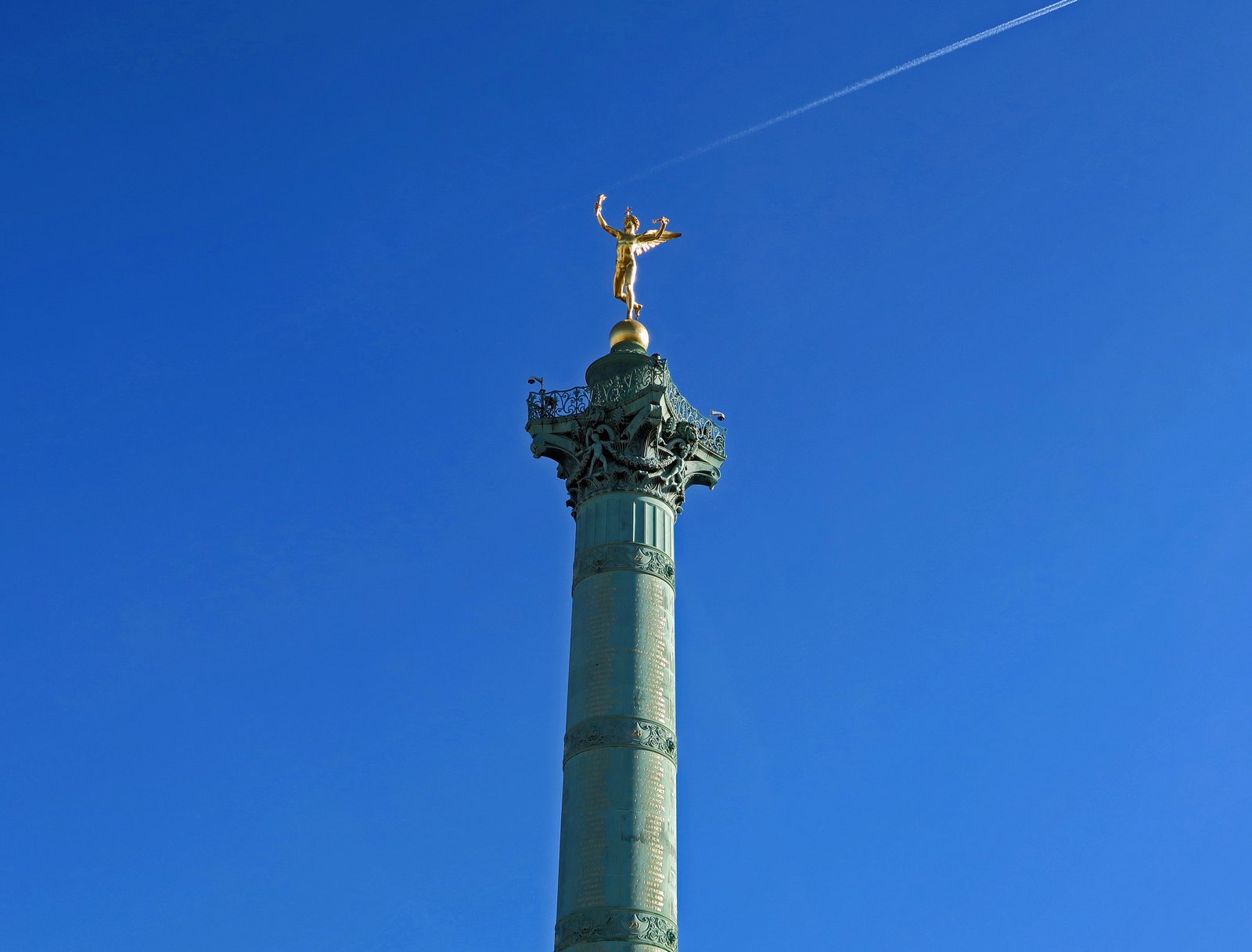 In the center of Place de la Bastille resides the Colonne de Juillet. Topped by a Statue of Mercury, which looked like it was reaching for the contrail in this capture.