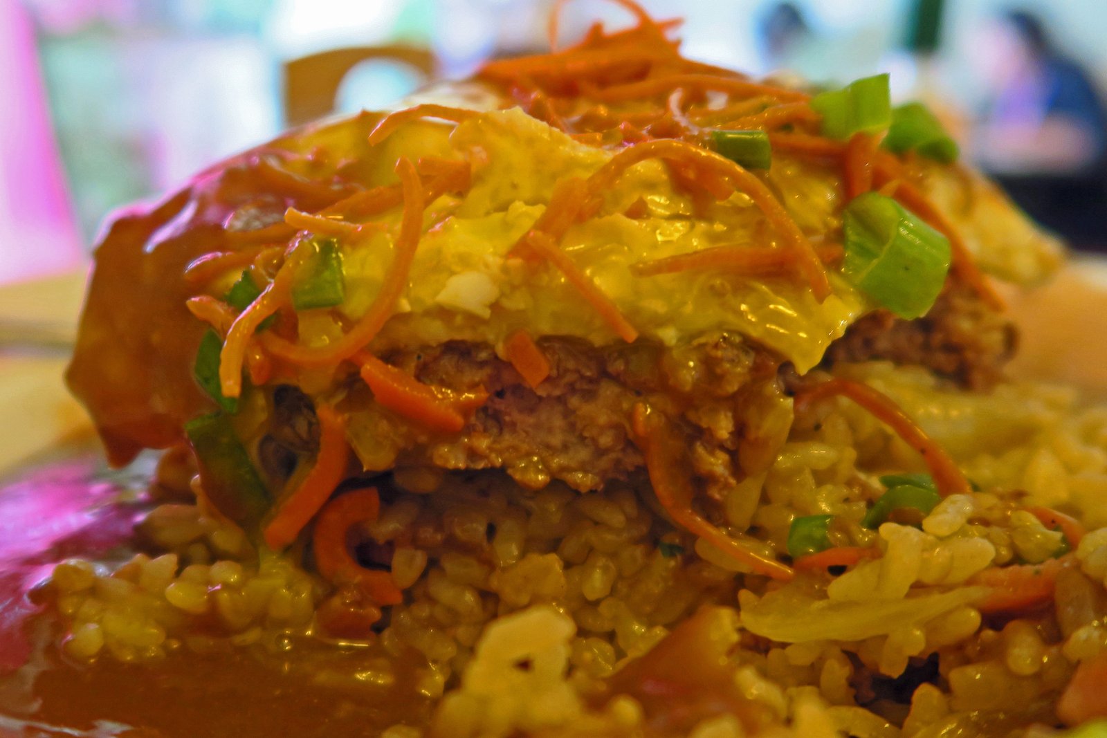This wasn't good eats, from the very gluey, tasteless gravy; which had the same viscosity as the egg yolk. They just kind of oozed into one another. To the burger which was pretty darn tough, to the rice which was again on the dry side. I just didn't care for this.