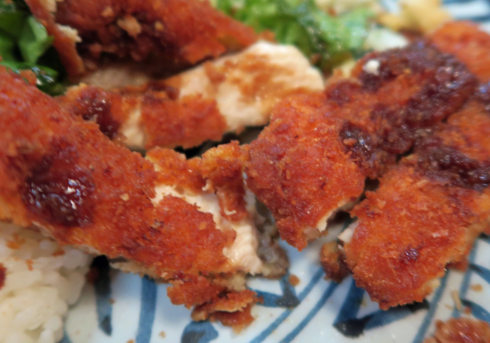 I have no idea what this was supposed to be, but I don't think it's what I ordered. That tonkatsu was pounded very thin, breaded, then fried to a dry, stringy place that can only be described as death. What's up with the bland sautéed onions and the frozen peas and carrots? Kind of sad because the Ginger Ahi was nicely flavored, not too much ginger, good soy, not too salty, the fish was nicely mixed and coated well, and there were only a few pieces with too much connective tissue. I'd easily have that again.