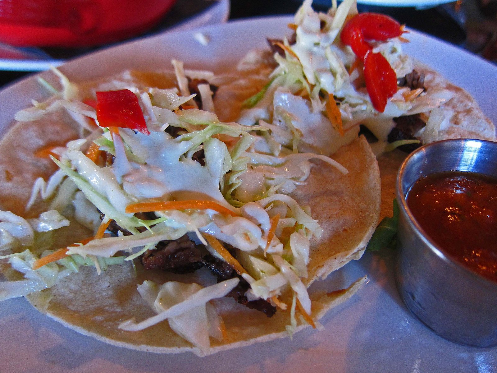 Yuma is one of those rare places where one can get good Mexican food even at restaurants that are not primarily Mexican restaurants â probably because most of the cooks in Yuma restaurants are Mexicans or Mexican-Americans. Anyway, those fish tacos, while extremely simple, were outstanding. There was just enough white sauce, the cabbage added some vegetable crunch, the salsa was remarkably smoky and spicy, and the fish fillets (yes, each taco contained an entire pollock fillet) were perfectly fried, crunchy on the outside and moist and flavorful inside: