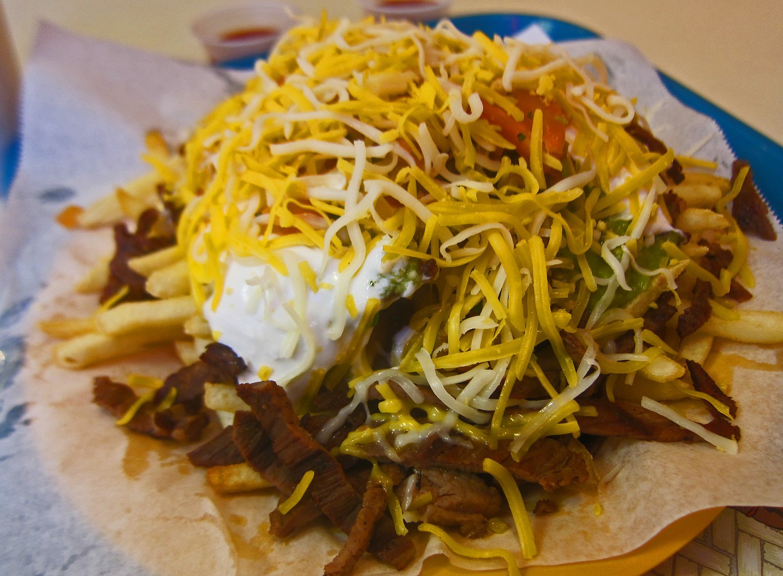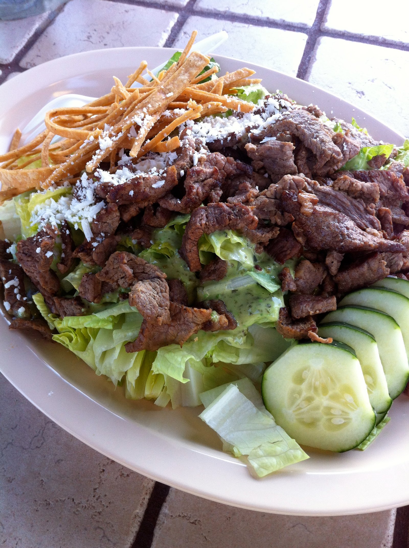 It was some very dry gyro meat on cold tortillas, topped with a tasteless under ripe tomato slice, topped with a sorta-tzaziki sauce that was too thick. Man, this was just plain bad.