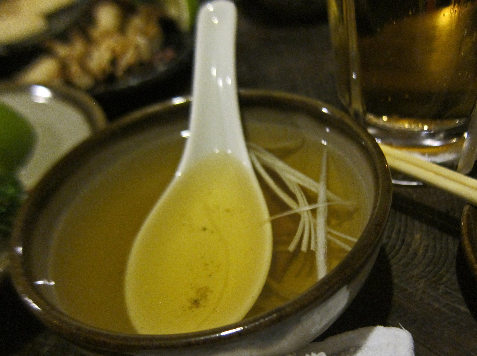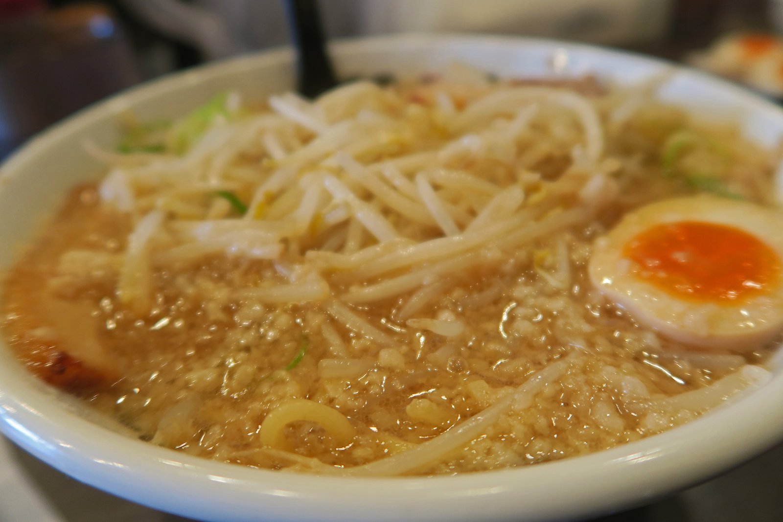 When my bowl arrived, I could see what looked like rice porridge on top of the ramen. It quickly became clear that these werIMG_3964e silky little minced pieces of fat. Some of which melted away, some not. It added quite a bit of richness to the broth, which, in spite off all this fat, never became greasy. It added a different dimension to what was pretty much a ubiquitous bowl of ramen. The tonkotsu broth (minus the rendered pork fat) was fairly light and on the salty side. The noodles were done adequately…the Missus said the boiled eggs were decently flavored, though a bit on the over-cooked side for Her taste. There was a huge amount of beansprouts, I enjoyed the textural contrast it added to the ramen. The broth wasn't quite hot enough for us, which would have ended up in an even richer bowl of ramen in my mind.