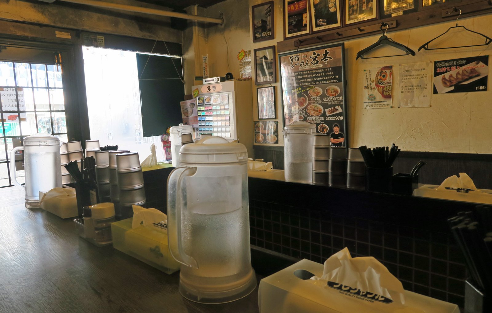 There was one person manning the shop and one customer in attendance. The typical ramen ticket machine in the corner. The Missus couldn't make out some words and the proprietor (his photo was on the posters adorning the walls) was nice enough to point to different photos on the walls so we could correlate them to choices on the machine.