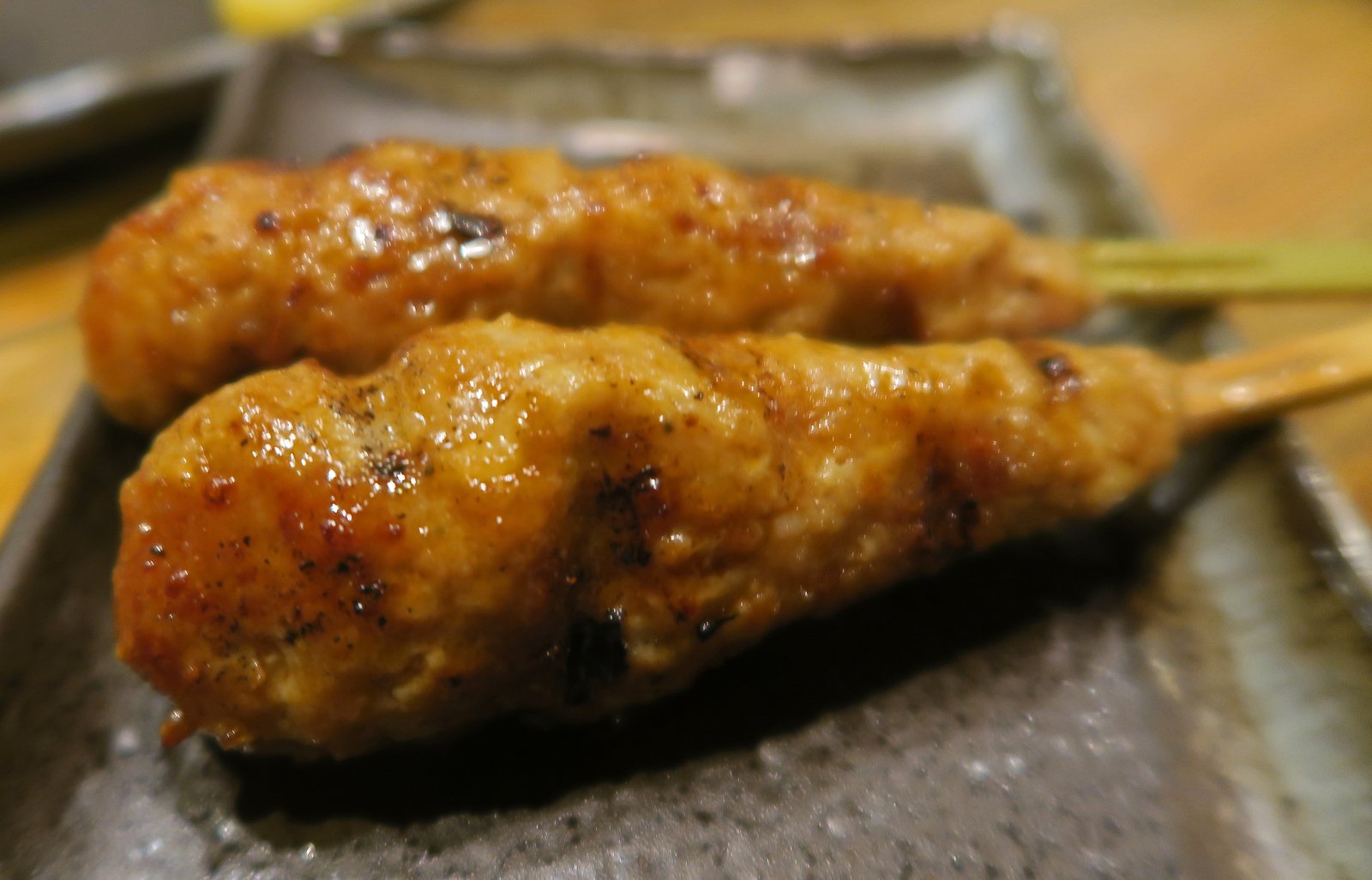 IMG_3891And the Missus did want to eat a lot of yakitori on this trip, right? The place was a hoot; the young man who managed the front of house would loudly greet guests as they entered and shout to find seats for customers. In this photo he is shouting upstairs to find a table for some customers. The staff were friendly and quite boisterous. There was an English menu, but we decided to ignore it and take a walk around the counter to see what we wanted.