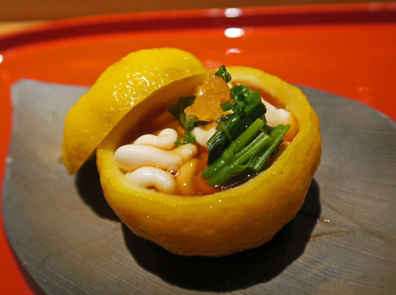 I will say, some the simpler items were just amazingly perfect; the smoked duck was moist and tender that you would think it was pork, except it had that nice duck flavor….the ginnan, earthy, with a hint of sweet and bitter but also made crunchy. The two almost ohitashi like dishes; the greens and mushrooms with yuzu, topped with beautiful, briney ikura, served in a hollowed out yuzu….the fragrance of the fruit adding a nice touch. The tai with shiokara sauce, sweet, pungent, chewy and silky smooth at the same time. The bo-zushi was a fantastic combination of milky and savory flavors, cut by the vinegar in the rice. You really could go on and on…..